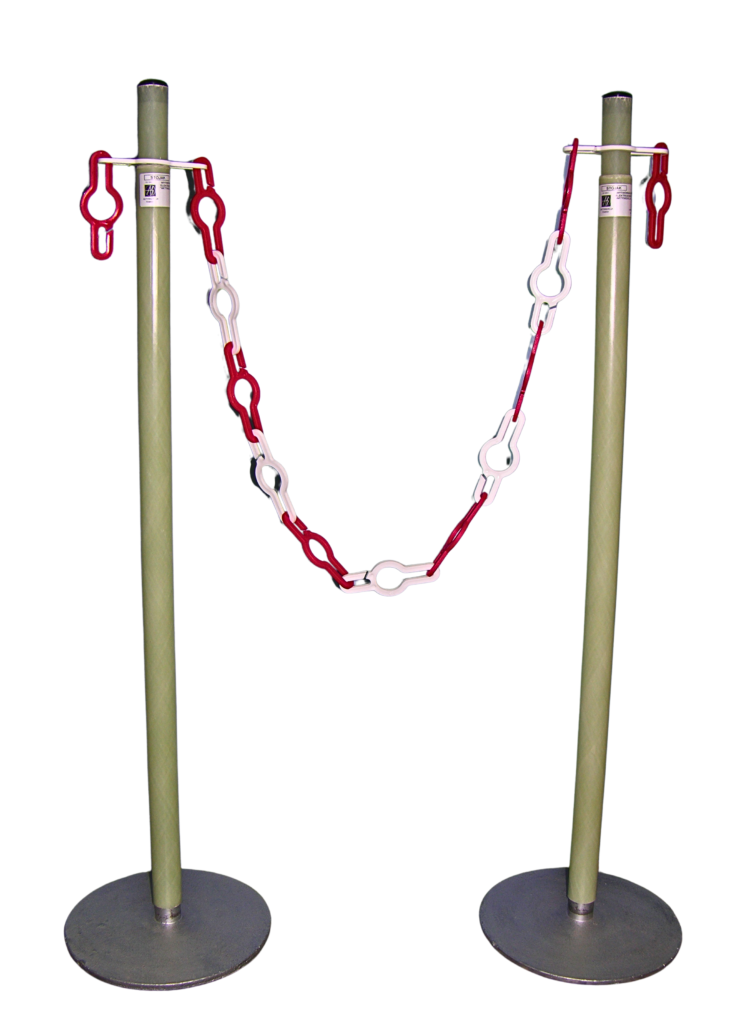 Ogrodzenie przenośne służy do zabezpieczenia miejsca pracy przy urządzeniach elektroenergetycznych. Ogrodzenie składa się ze stojaków w postaci rur szkłoepoksydowych, nasadzanych na żeliwne podstawy, oraz z łańcucha ogniw mocowanego na stojakach. Ogniwa łańcucha wykonane są z tworzywa sztucznego w kolorach białym i czerwonym, co przy naprzemiennym łączeniu daje dobrą widoczność ustawionego ogrodzenia. Istnieje możliwość wykonania ogniw w innym kolorze.