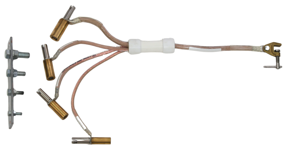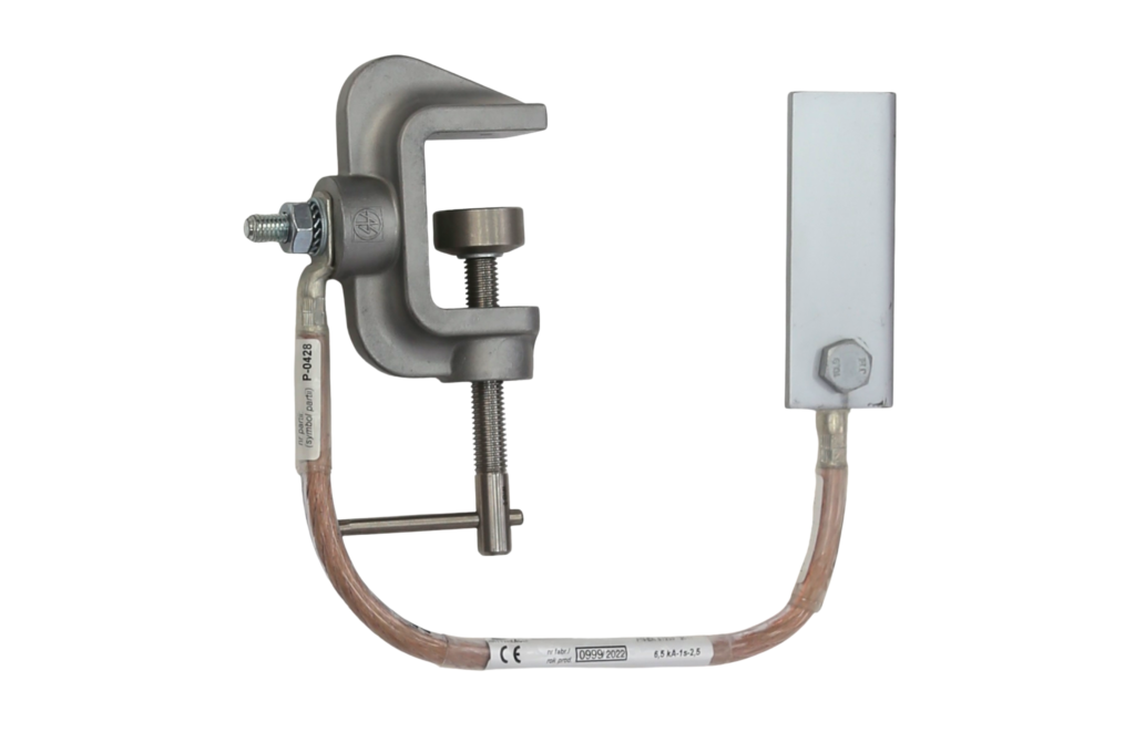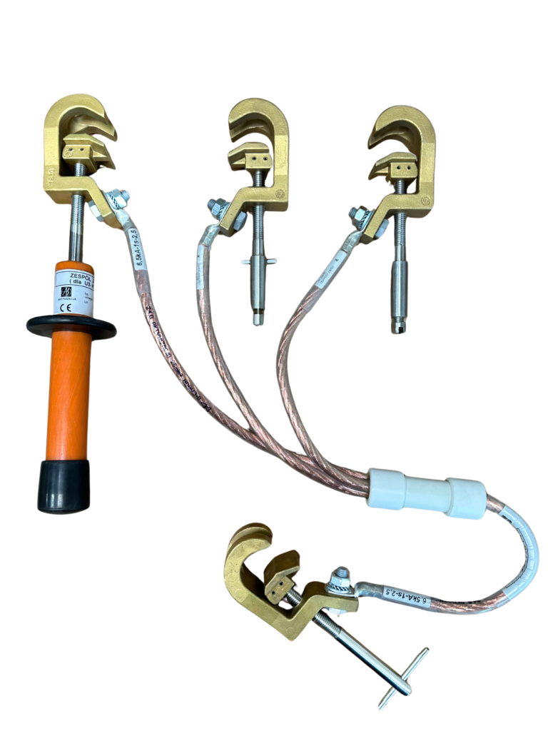Zestaw przeznaczony jest do uziemiania napowietrznych urządzeń trakcyjnych przez połączenie wysięgu pomocniczego przewodu trakcyjnego z szyną jezdną.